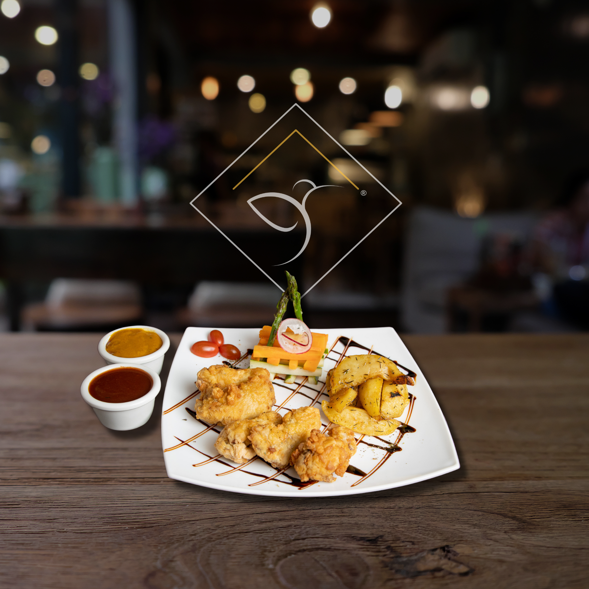 Acompañadas de papas fritas, salsa miel y mostaza, ensalada |Bebida
