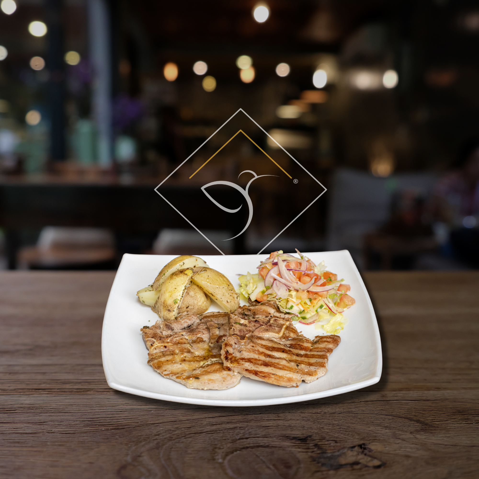 Acompañada de papas salteadas, ensalada (incluye arroz y menestra) |Bebida