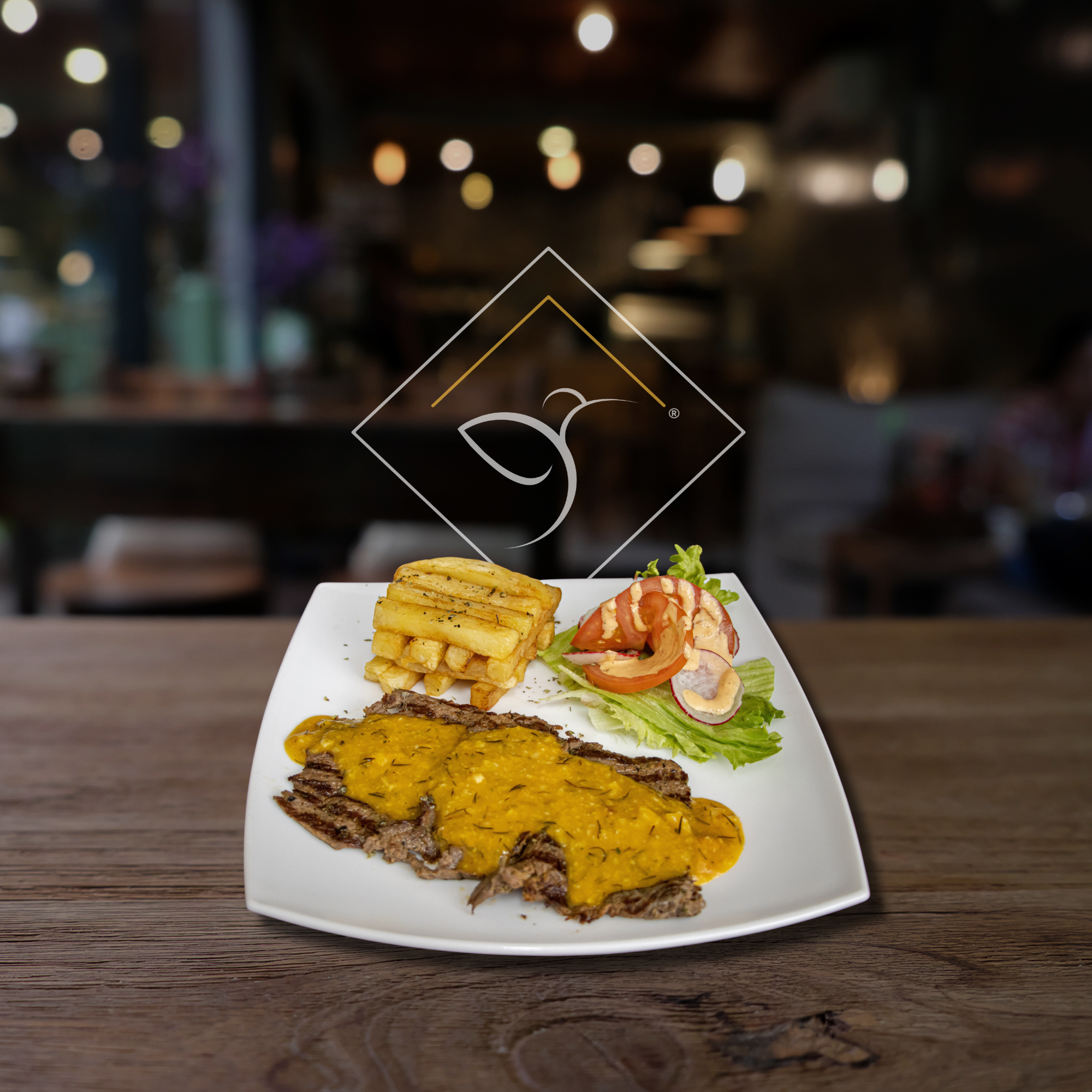 Acompañado de papas fritas, ensalada, salsa al ajillo |Bebida