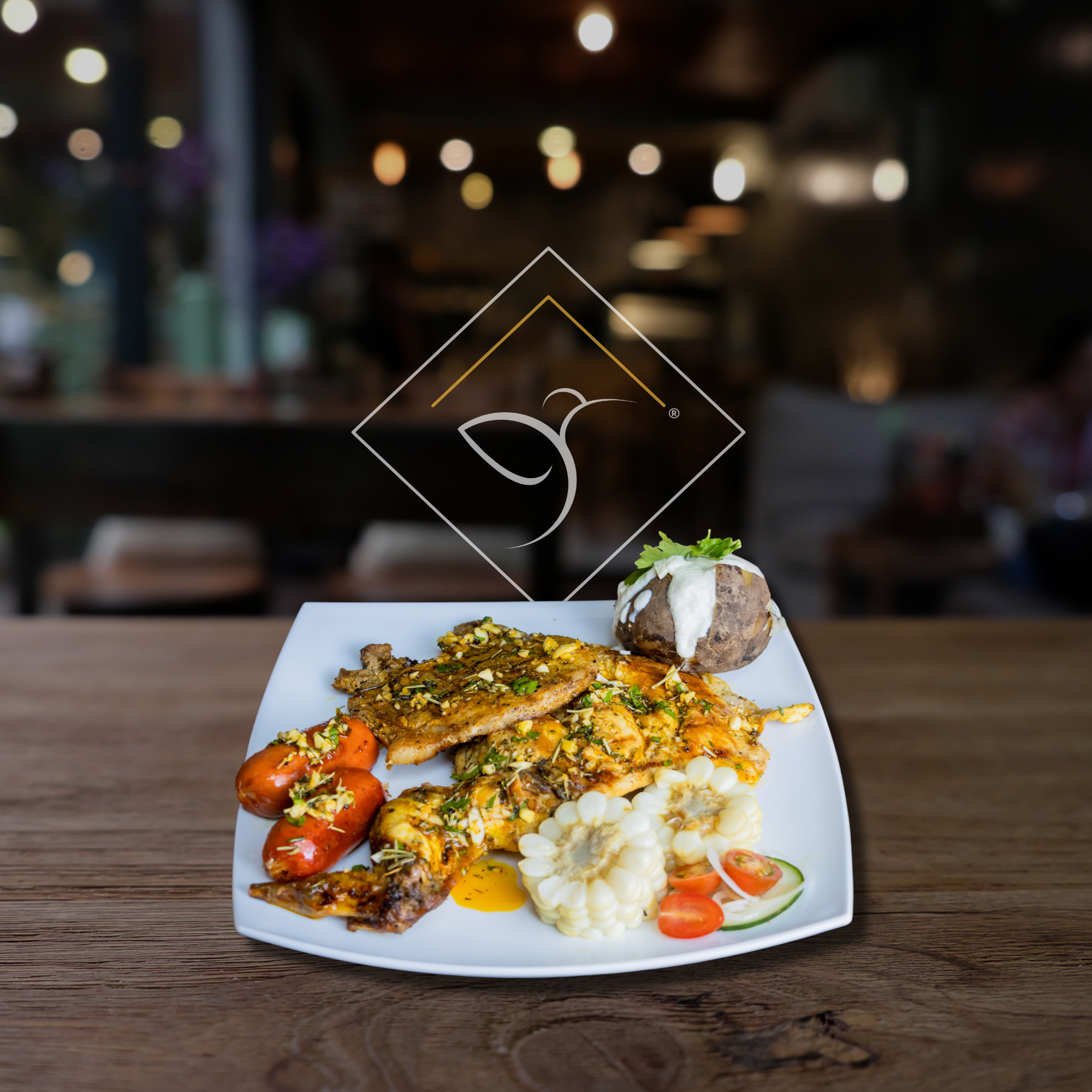 Acompañada de papa, mayonesa, ají, ensalada (incluye arroz y menestra) |Bebida