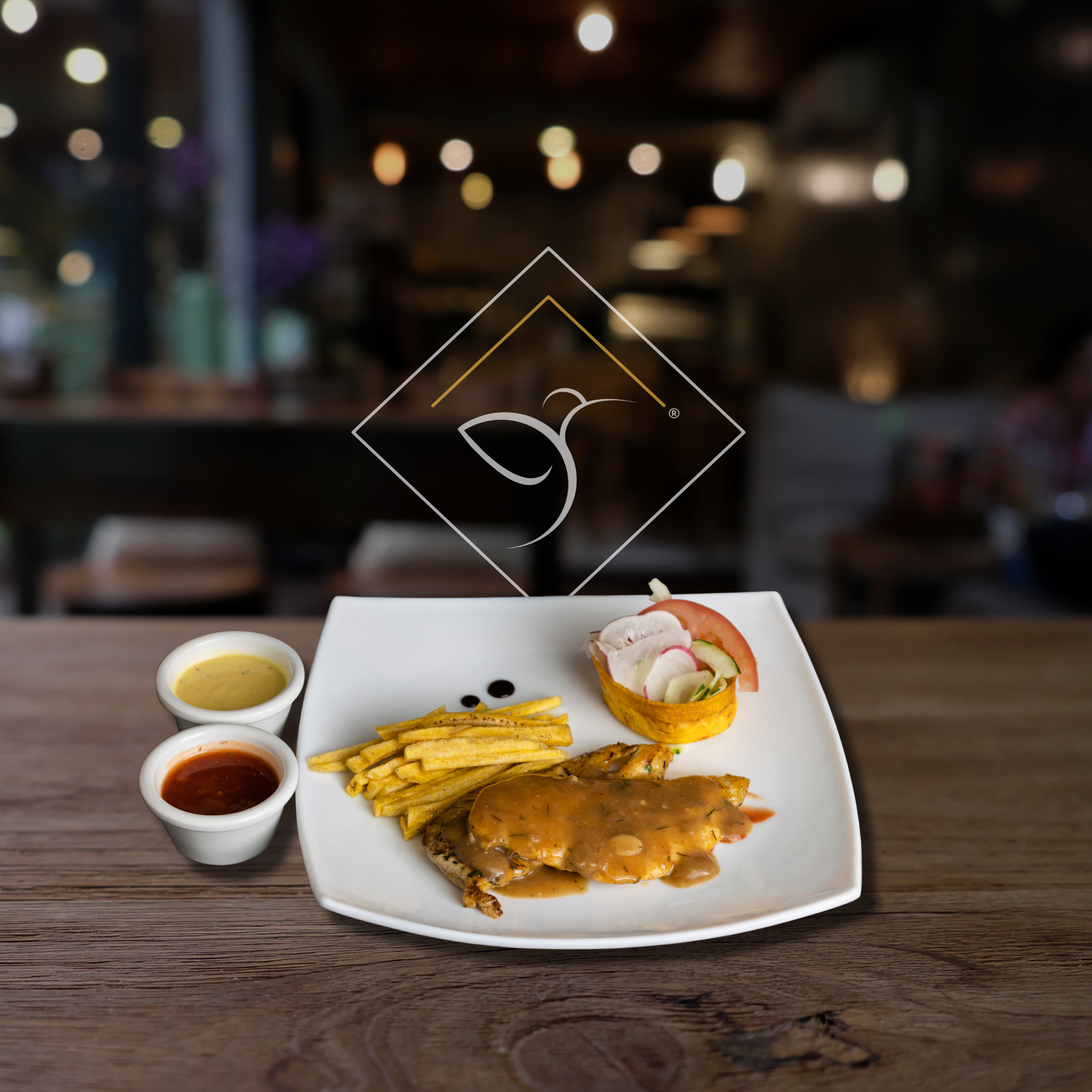 Acompañado de bastones de verde, salsa de pimientas, ensalada |Bebida